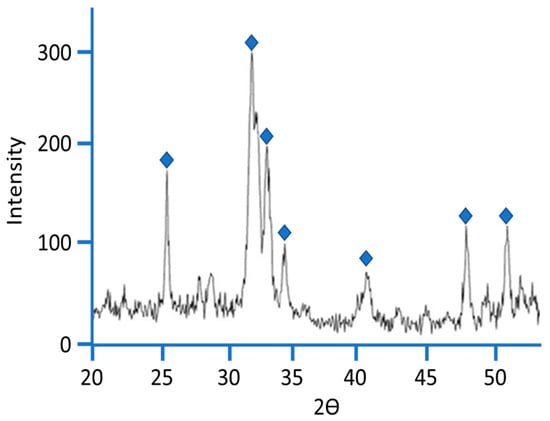 Furthermore, XRD measurement was used to identify the presence of hydroxyapatite on the hybrid surface. The intense peaks of crystalline hydroxyapatite are visible in Figure 8 (◆), confirming that the material surface was covered by a hydroxyapatite layer after 21 days of soaking in SBF. In Figure S3, XRD measurements show the amorphous structure of the sample before being soaked in SBF. Moreover, this result suggests that the hydroxyapatite layer is too thick to allow the detection of XRD signals from the hybrids’ surface [,,,,].