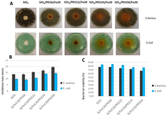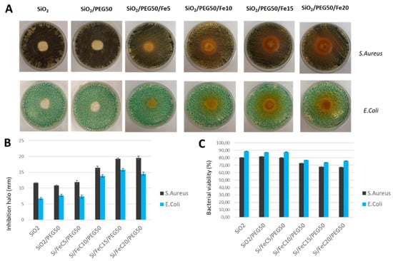 (A) Representative inhibition halos (ID) of S. aureus and E. coli with SiO2/Fe(II)C 20%/PEG 6, 12, 24, 50 wt%. (B) Diameter (mm) of inhibition halos of all materials incubated with S. aureus and E. coli. The values are the mean ± SD of measurements carried out on samples analysed three times. (C) Bacterial viability (%).