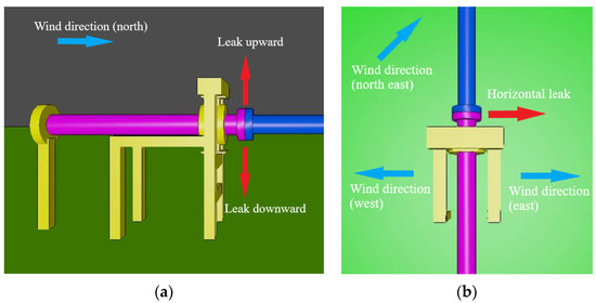 (a) Section view of the manifold showing two vertical leaks and wind directions; (b) plane view of the manifold showing the horizontal leak and wind directions.