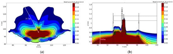 (a) Plane view of the downward leak spreading across the ground with LFL distance of 35.7 m; (b) section view of the downward leak at the leak source with a height of 0.65 m.