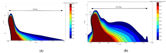 The third reason is that a tailwind leak will not suffer “push back” as a headwind would. The opposing headwind reduced the leak velocity, leading to a smaller LFL distance. Figure 6a,b show the section view of tailwind and headwind leak, respectively. The LFL distance was 49.83 m for the tailwind leak and 32.53 m for the headwind.