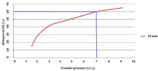 To gauge the adequacy of the proposed leak model to use for risk assessment, the gas dispersion result was compared with the LNG bunkering technical reference, TR56. This technical reference was produced by Enterprise Singapore and recognized by Singapore maritime authorities [30]. TR56 provides an LFL distance vs. stagnation pressure graph, shown in Figure 7, to advise how far flammable leak NG can disperse. The graph is based on a continuous release through a 25 mm-diameter hole. No further information on the surrounding geometry and wind condition was provided. Therefore, it is assumed the TR56 wind condition and geometry are identical to those in Section 3.1 leak scenario.