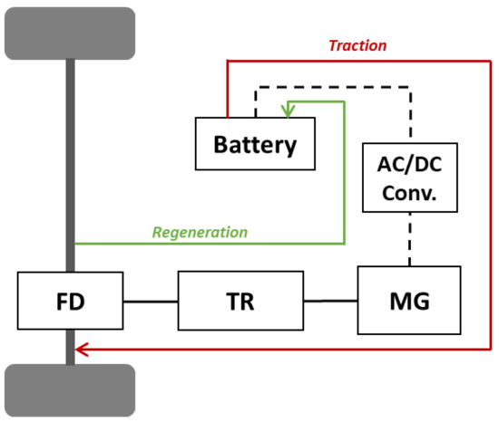 Figure 1. Vehicle velocity was used as the only input signal to compute the traction or braking power required for the vehicle. A backward-facing approach was therefore employed for the analyses in which the power demanded by the road is back-propagated throughout the driveline, starting from the wheels and reaching the battery. Consistently, with traction or braking (i.e., battery regeneration) events, energy was considered to be flowing out of (red arrow) or into (green arrow) the battery, respectively. Accordingly, the resistant forces (and powers) were defined for each powertrain component (i.e., wheels, frontal final drive, gearbox) until the motor/generator (MG). The latter was responsible for providing the vehicle with the proper propulsion through the front axle (i.e., driven axle). Finally, the electric power required by the MG was considered as the real power demand of the battery.