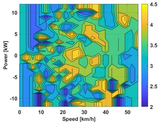 is the motor electric power. The latter was calculated by multiplying or dividing the mechanical power by the motor efficiency according to braking or traction conditions, respectively. The motor efficiency was calculated according to a downscaled version of the efficiency map of a reference MG made for a passenger car application. The original map is shown in