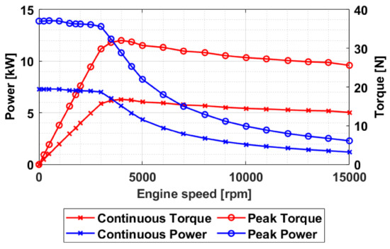 Figure 4. A distinction between peak and continuous MG outputs was involved in the study to include the effects of the BTMS control on the battery. In fact, a possible action of the BTMS is to reduce battery power after peak power/torque values have been demanded for a given amount of time. Such a condition is typically involved in the control of the BTMS for electrified vehicles to prevent overheating phenomena. To clarify, non-complex strategies are typically involved for cooling the battery pack of very light vehicles (e.g., L7). A common solution is to embed a passive air-cooling system. Nevertheless, given the target of this research, the authors have chosen to avoid such an assumption and include the possibility of the BTMS to cut the current and power of the electric sources.