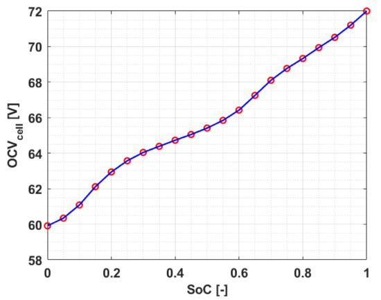 In particular, the OCV increased with the battery SoC, whereas the equivalent resistance showed a significant drop for low SoC values and plateaued for SoC higher than 20–30%. The battery features are reported in