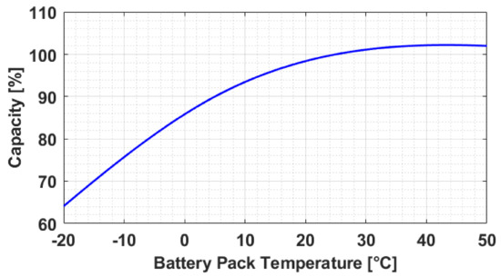 Figure 7. A particular phenomenon was highlighted by temperatures over 25 °C as the battery capacity tended to overcome the nominal value. Nevertheless, high battery pack temperatures were typically responsible for producing faster aging and a drastic reduction in battery performance. More precisely, a reduction in the battery internal resistance and a higher frequency of over-discharging phenomena occurred, as shown in [