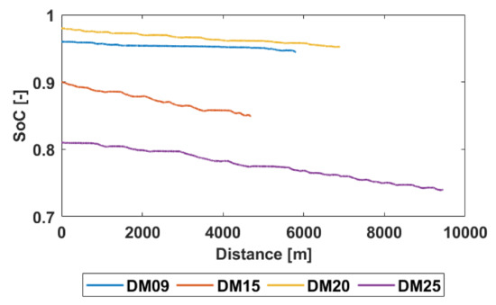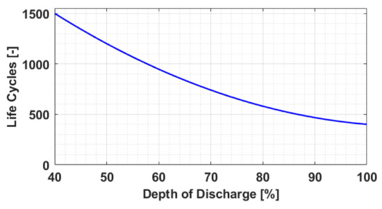 Figure 8 was considered for the analyses. To clarify, a life-cycle was considered as a complete discharge until the DoD was reached, followed by a complete recharge of the battery. It can be noted that a significant effect on the available capacity was produced by a change in the DoD. In fact, increasing the DoD can lead to an increase in the driving range of the vehicle but also to a reduction of the maximum life-cycles admitted. Specifically for the data shown in