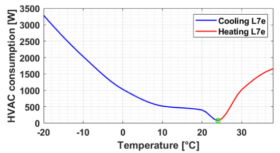 32]. The heat produced by human bodies was added when the system was under cooling conditions, whereas it was subtracted under heating mode. No other thermal loads were considered in the study (e.g., sun irradiation) since they represent a minor impact on overall HVAC consumption [