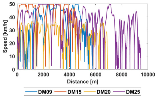 The BEV model for an L-7 vehicle and the methods developed for achieving estimations of the battery SoC variation and the residual driving range are presented within this section. Both battery SoC and residual range were estimated by relying upon previous battery power demand data acquired under real-world conditions. Since battery power demands can be considered as directly related to the vehicle’s velocity along a driving mission, the availability of experimental data was viewed as an important opportunity to include driver behaviour, road and traffic conditions simultaneously in the analyses.