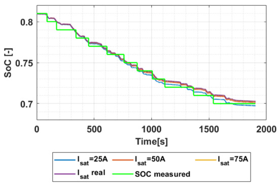 and included in the model. This value was considered constant for any traction phase, while a saturation was analysed during braking conditions. Since relevant power might flow into the system due to impressive regenerative braking phases, the possibility of cutting the maximum current at the AC/DC converter might be necessary to avoid harmful events in the battery. Accordingly, several levels of the maximum recharging current (saturation current,