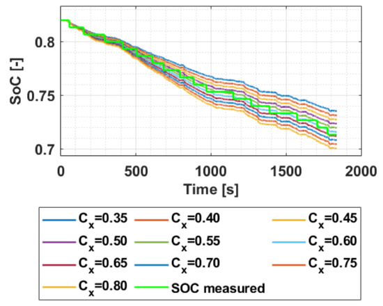 . Equation (22) shows a different formulation with respect to (21), as a given set of additional parameters must be estimated. To achieve this, the two correction factors were estimated based on the relative variation of the available battery capacity with respect to the battery capacity nominal value (100%). The data were processed according to the technical specifications of the L-7 BEV considered within the STEVE project [