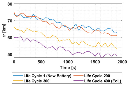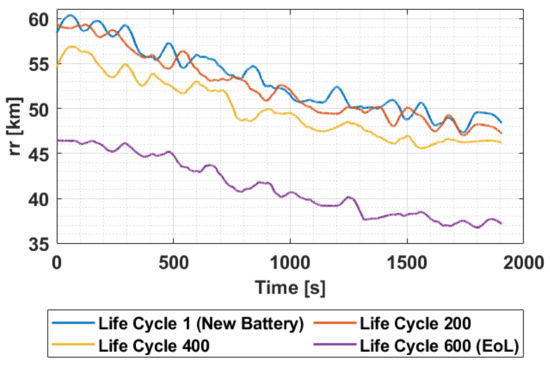 Figure 8, a DoD equal to 80% could allow the battery to improve the life cycles by 50%, increasing from 400 (with DoD equal to 100%) to 600 life-cycles. This value was selected on the assumption that it could represent the best trade-off between battery usage (i.e., battery longevity) and electric range.