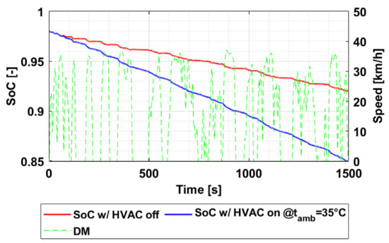 Once the available capacity of the battery was determined, a correct evaluation of the battery SoC was performed by producing a good estimation of the current flowing into the battery (see Equation (20)). To achieve this, the power required by the road (i.e., the traction/braking power) must be coupled with any further power demand. For a BEV, auxiliary loads assume a relevant role and therefore their inclusion in the model is needed [