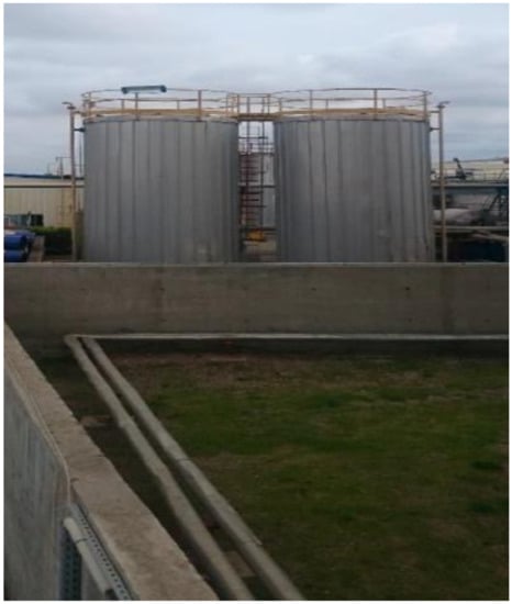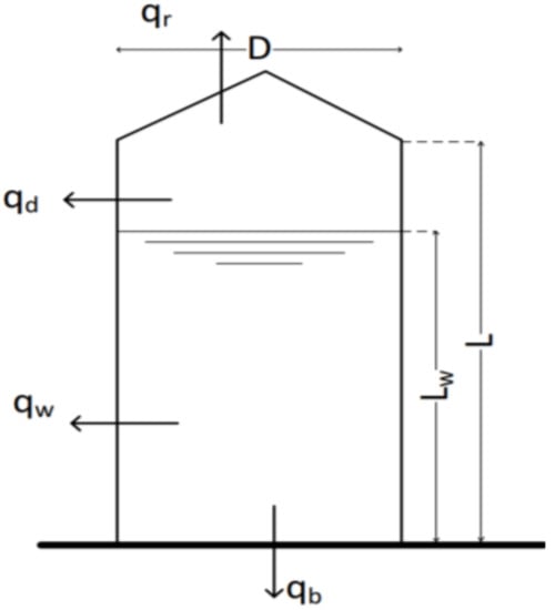 The heat losses from the bitumen storage tank (Figure 2) to the ambient were evaluated based on heat transfer calculations. In this case, the heat transfer rate was strongly related to the isolation quality, tank configuration, ambient temperature, wind speed, and the temperature difference between the tank and air or ground []. Therefore, the tank surface area was divided in four parts as shown in Figure 3: the dry sidewall, the wet sidewall, the tank bottom and the tank roof.