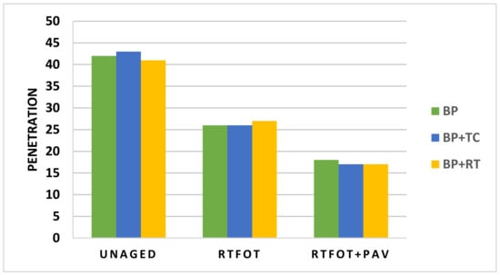 Penetration test results of all the samples at different ageing stages.