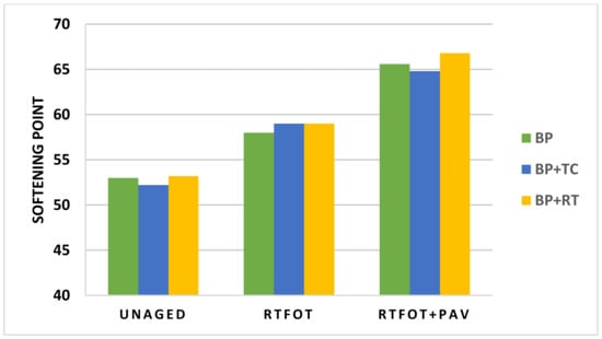 Figure 6 and Figure 7 show the ageing index for penetration at 25 °C and softening point R&B, respectively. We can see from Figure 6 that, after RTFOT and RTFOT + PAV the penetration of BP reached 0.62 and 0.43 times that of the unaged binder, respectively; the penetration of BP + TC reached 0.6 and 0.4 times that of the unaged binder. Additionally, the penetration of BP + RT reached 0.66 and 0.41 times that of the unaged binder. Figure 7 shows that the softening point of BP attained 1.09 and 1.24 times that of the unaged binder, the softening point of BP + TC reached 1.13 and 1.24 times that of the unaged binder, and the softening point of BP + RT reached 1.11 and 1.25 times that of the unaged binder, after RTFOT and RTFOT + PAV, respectively.