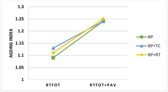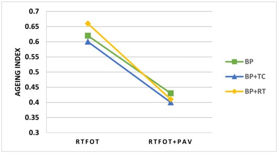 We can see from the figures that BP + TC aged more than the other two samples after short-term ageing. After long-term ageing, the softening point ageing index showed the same ageing degree for all three samples. The penetration ageing index shows that the BP + TC aged more than the other samples confirming the short-term ageing results. The differences between the penetration ageing index values and the softening point ageing index values are insignificant at the long-term ageing stage. This means that at the end of the bitumen lifetime, we will have the same ageing degree whether we maintain it at 150 °C during its storage, store it at ambient temperature for 90 days, or fluctuate it between 140 and 160 °C for three months.