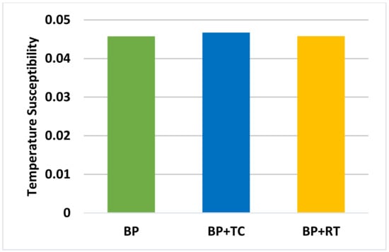 We calculated the penetration index for our three samples according to Equation (10), and the results are shown in Table 3. Then, we calculated the temperature susceptibility using Equation (11) and represented the results in Figure 8. We can see from Table 2 that the PI values of BP and BP + RT are the same, whereas it decreased a little for BP + TC. Observing Figure 8, the temperature susceptibility values of BP and BP + RT are the same (0.045), whereas that of BP + TC (0.046) has increased by 0.001, which we can consider negligible. Thus, these results confirm the previous results, showing that the control sample and the room-temperature-stored sample are the same, which means that bitumen storage at 25 °C for 90 days does not affect its physical properties. Although the thermally cycled sample exhibits a small change, we can store bitumen in a dynamic temperature-heating regime, between 140 and 160 °C, for three months or less. The difference in physical properties was imperceptible for three months of storage and will be more negligible or nonexistent if the storage duration is shorter.