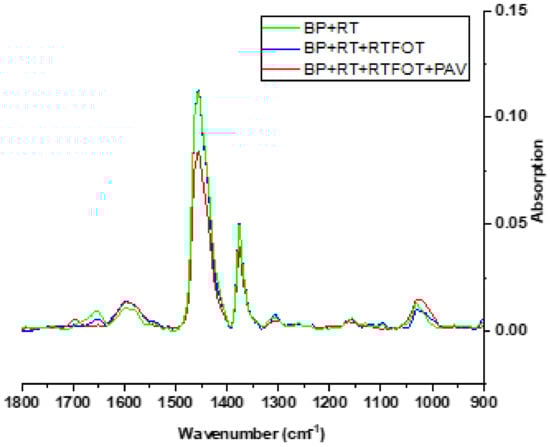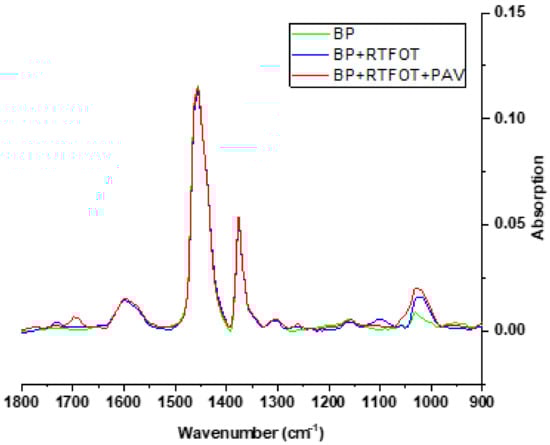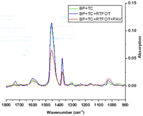 We collected the spectra between 4000 and 400 cm−1, but we have presented only the part that contains the peaks of interest. To have a clearer presentation of the peaks, we used OriginPro software to perform baseline correction. Figure 9, Figure 10 and Figure 11 show the absorption spectra (after baseline correction) for BP, BP + TC, and BP + RT, respectively, at different ageing stages (Unaged, RTFOT-aged, RTFOT + PAV-aged).