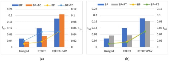 We can see from the unaged stage results in Figure 12b that room temperature storage did not affect the carbonyl amount because BP and BP + RT had the same ICO (0.010), although it led to an increase in sulfoxide formation (from 0.053 to 0.072). After short-term ageing, the ICO results confirm those of the unaged stage; the carbonyl index values of BP and BP + RT are very close (0.014 and 0.017). BP + RT kept its initial ISO (0.073) after short-term ageing, whereas the value of ISO for BP doubled from 0.053 to 0.118.