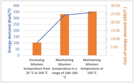 The bitumen storage process is highly energy-consuming because pure bitumens are supposed to be maintained at high temperatures that go from 130–150 °C for the softest, PG (Penetration Grade) 160/220, to 175–190 °C for the hardest, PG 10/20 []. The purpose is to keep the viscosity of bitumen at a level that allows us to pump it smoothly. In addition, to avoid the risk of damaging its properties by exposing it to a temperature that is lower or higher than its normal range.