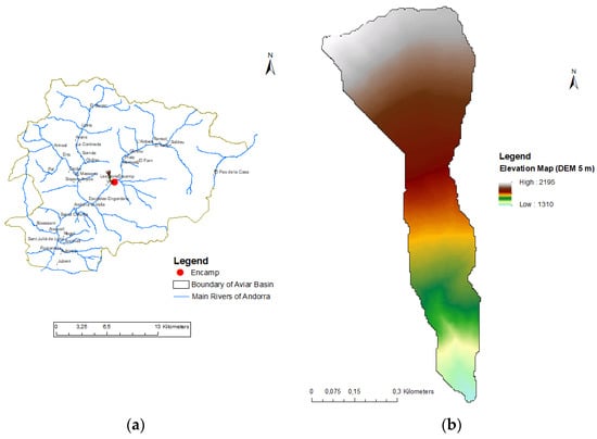 Study area description: (a) Location of study area in Andorra. (b) Digital elevation model (DEM) for the Aviar Basin (www.icc.cat, accessed on 17 December 2013) [3].
