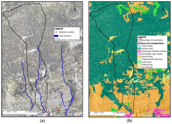 Study area description: (a) Study area and sample location, (b) surface soil composition map from Sigma (http://iea.ad/sigma, accessed on 17 December 2013) [3].