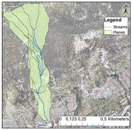 Following the steps described in Section 3.4.2 above, we defined the study basin characteristics (Table 3 and Figure 4) and the study basin area discretization scheme using KINEROS 2 (see Figure 5).