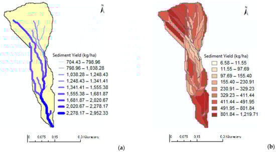 Graphical representation of eroded solid material from KINEROS 2 (in kg/ha) for Event 1: (a) sediment produced in kg/ha at streams, (b) sediment produced in kg/ha at Aviar Basin [3].