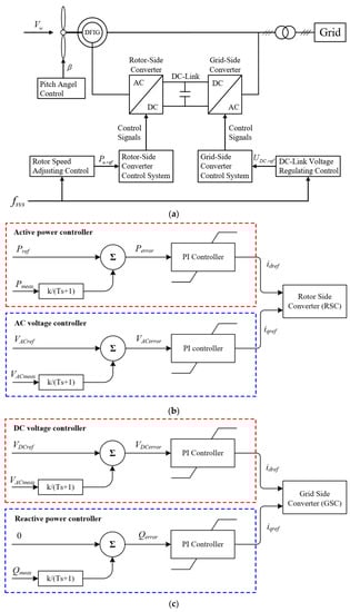As illustrated in Figure 1a, the DFIG controller system includes a pitch controller, rotor side converter (RSC) controller, and grid side converter (GSC) controller. The aim of the pitch controller is to avoid ωr from the maximum value and achieve de-loading operation. The objective of the RSC controller is to adjust torque (active power) of the DFIG, as displayed in Figure 1b. The aims of the GSC controller are to keep DC-link voltage at reference values and regulate the reactive power injection to the grid, as displayed in Figure 1c [22].