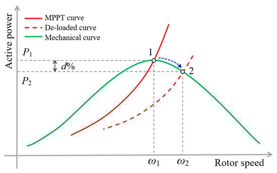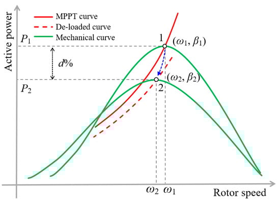 Figure 2 and Figure 3 illustrate the de-loaded curves with d% reserve power when the DFIG performs over-speeding and pitching, respectively [12,14]. The black and red solid lines indicate the mechanical power curve and electrical output power of the DFIG when performing MPPT operation. The red dotted line represents the de-loaded curves when performing pitching and/or over-speeding. Operating points 1 and 2 are the MPPT and de-loaded operating points, respectively.