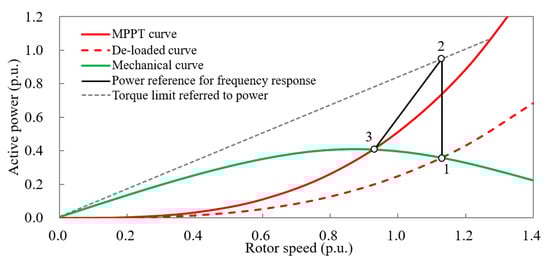 where Pref(ωr) is the power reference when performing frequency support. ω1 and ω3 are the rotor speeds at operating point 1 and operating point 3, respectively, in Figure 5. ωr is the rotor speed of the wind turbine. Ptor(ω1) is the torque limit referred to the power at ω1. PMPPT(ω3) is the maximum available power at operating point 3 in Figure 5.