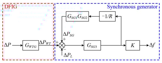 As shown in Section 3.2, the DFIG supports the system frequency using a constant ΔP after detecting a disturbance. Figure 6 shows a simplified diagram of a DFIG and a synchronous generator (SG) for the local stability analysis.