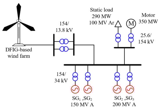 Figure 8 illustrates a model system to explore the performance of the enhanced frequency response scheme. Such a model system comprises four synchronous generator (SGs), motor load, static load, and DFIG-based wind farms.