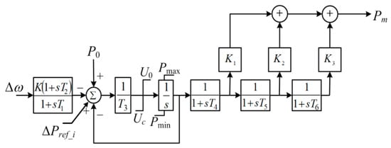 where TG is the time constant of the governor and is set to 0.1 s, and TP is the time constant of the prime mover and is set to 0.3 s [26]; α and β are the angular momentum and damping coefficient of the SG and are set to 9.7 p.u. and 0 p.u., respectively [27].