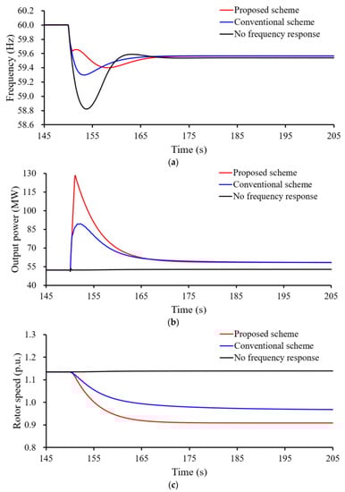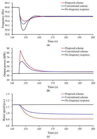 Furthermore, the setting frequencies with no frequency response, conventional frequency response, and proposed enhanced frequency support scheme are 59.539 Hz, 59.561 Hz, and 59.568 Hz, respectively, since the output power of the proposed enhanced frequency response is more than the others after supporting the frequency.