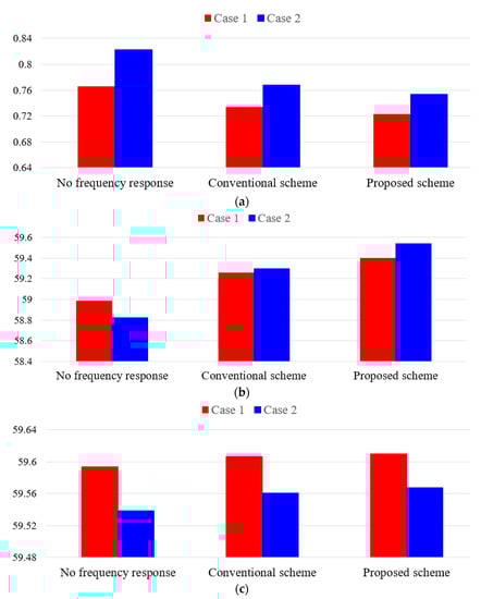 Comparison results for Case 1 and Case 2: (a) maximum ROCOF; (b) frequency nadir; (c) Settling frequency.