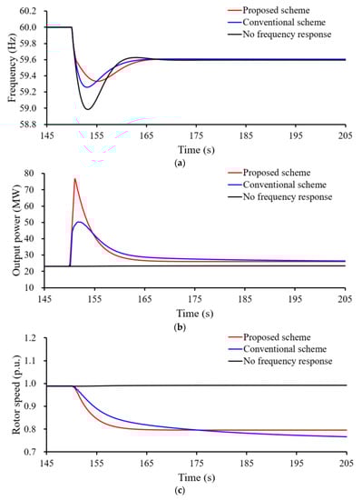 Figure 10 illustrates the simulation results for Case 1. When the DFIG operates in de-loaded operation without frequency response, the maximum ROCOF and frequency nadir are −0.766 Hz/s and 58.984 Hz, respectively, since there is no active power injection from the DFIG. The maximum ROCOF and the frequency nadir with the conventional frequency response are −0.734 Hz/s and 59.257 Hz, respectively, because an amount of active power is injected from the DFIG to the power grid. The frequency nadir and the maximum ROCOF with the proposed enhanced frequency response are improved to 59.396 Hz and −0.723 Hz/s, respectively, because more power is injected from the DFIG to the electric power system due to the suggested power reference (see Figure 10a,b). Furthermore, the setting frequency with no frequency response, the conventional frequency response, and the proposed enhanced frequency response are 59.594 Hz, 59.607 Hz, and 59.610 Hz, respectively, since the power reference switches to the MPPT curve at operating point 3 (which is more than those of the other frequency responses.)
