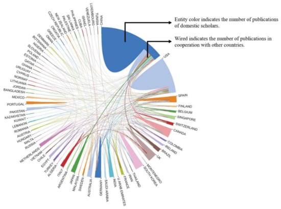 The number of publications from different countries where CIM studies are conducted. (The fan-shaped arc in the figure represents the number of publications published by different countries which are arranged in descending clockwise order according to their total number. The connection represents the joint publication relationship between different countries, and wider connections represent more joint publications.)