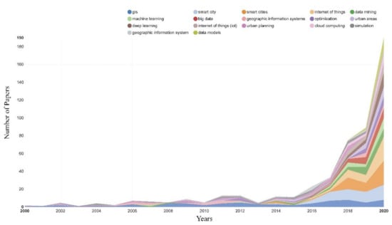 “City information model” and “city information modeling” were used as search keywords, and 1648 papers were retrieved from the core database of the Web of Science (from 1985 to 2020). These papers are related to the following six fields: construction building technology, civil engineering, regional and urban planning, urban studies, computer science interdisciplinary applications, and computer science information systems. These papers were analyzed using an online analysis platform published by bibliometric.com [18].