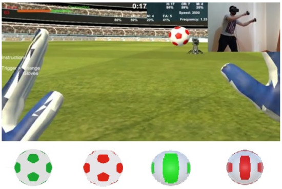 The task was selected from the set of drills included in the prototype version of the VkeepR app made available by MentisVR Ltd. (www.mentis-VR.com, (accessed on 4 October 2021)). By donning a VR head-mounted-display (HMD), users are immersed in a soccer pitch at a standing position between the goal posts. Body and hand movements are tracked with 6 degrees-of-freedom so that users can move in the virtual environment and block the balls by extending their arms. Handheld controllers that appear as goalkeeper gloves in the virtual environment serve to simulate arm movement. The task used involves 4 different types of balls—red and green footballs and red and green volleyballs—that are shot by a cannon positioned at some distance outside the penalty area, straight ahead from the goalkeeper. For each participant, one of the four types of balls is set as the target type that must be blocked while the other 3 types are distractors that should not be responded to. Thus, the task aligns with the Go/No-Go paradigm in which responses are made to certain stimuli but not to others. Following extensive pilot testing, the speed, frequency, and landing positions of the balls at the goalposts were set to levels that made the task physically comfortable for participants. Participants were instructed to carry out the task by moving only their arms and avoid moving their body away from the initial standing position between the goalposts.