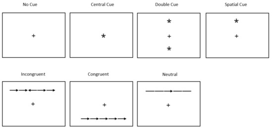 - McConnell, M.M.; Shore, D.I. Mixing measures: Testing an assumption of the attention network test. Atten. Percept. Psychophys. 2011, 73, 1096–1107. [Google Scholar] [CrossRef] [PubMed] [Green Version]