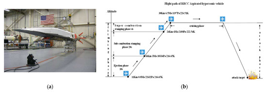 (a) X51A; (b) The flight path of an RBCC scramjet-propelled vehicle. The initial conditions of flow at different phases are as follows: Climbing phase: (1) ejection phase, duration time is about 10 s. Flight altitude is about 11 km, Mach number is 0.8, pressure is 22,700 Pa, temperature is 216.77 K, air density is 0.3648 kg/m3 and dynamic viscosity is 1.422 × 10−5 Pa·s. (2) sub-combustion stamping phase, duration time is about 20 s. Flight altitude is about 16 km, Mach number is 3, pressure is 10,350 Pa, temperature is 216.65 K, air density is 0.1663 kg/m3 and dynamic viscosity is 1.422 × 10−5 Pa·s. (3) super-combustion stamping phase, duration time is about 4 s, flight altitude is about 26 km, Mach number is 6, pressure is 2188 Pa, temperature is 222.54 K, air density is 0.0339 kg/m3 and dynamic viscosity is 1.454 × 10−5 Pa·s. Cruising phase: the flight altitude is about 30 km, Mach number is 6.5, pressure is 1197 Pa, temperature is 226.51 K, air density is 0.0181 kg/m3 and dynamic viscosity is 1.475 × 10−5 Pa·s.
