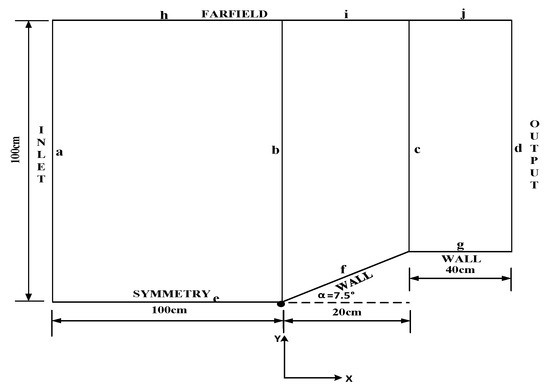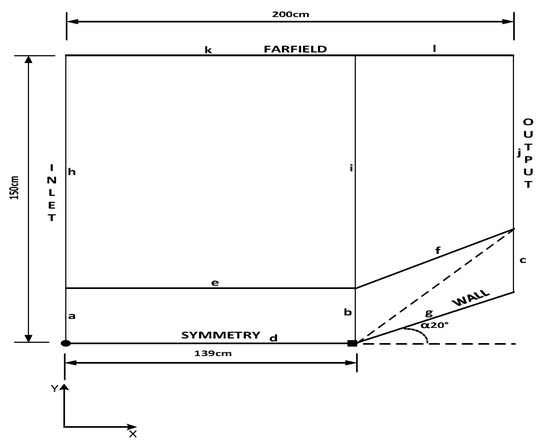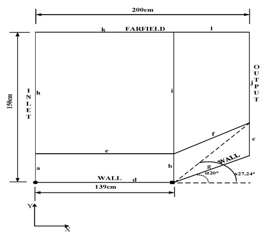 The experimental data in Ref. [23] are used to validate the simulation parameters at this stage, and the simulation external flow field model is as shown in Figure 2. The bold black dot is the (0,0) point of the coordinate system. Line f is the wedge section, line g is the flat plate.