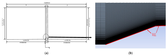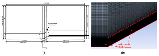 To determine the best domain size, a computational region analysis is performed. For this purpose, three sizes were chosen, as shown in Figure 7a [24]. The INLET boundary contains line a and h, the OUTPUT boundary contains lines d and k, the FARDIELD boundary contains lines l, m, and n and the WALL boundary contains lines o, p, and q. Because of the shock wave, in order to obtain more accurate results, more attention was needed for the grids near the shock wave regions. Figure 7b demonstrates the close view of the grids near the shock wave region. Taking the SST k-omega model as an example, the values of the ratio between the wall surface pressure p and , and temperature are as shown in Table 4, where x is the distance to the origin point of the wedge section, and the computational domain with 8c was chosen for low ratio errors. Next, three levels of different mesh were applied to ensure grid independency. From Table 5, the mesh with 520,000 cells was applied at this stage.