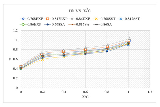 Figure 5 demonstrates the distributions of m under three different Mach numbers of freestream , where the X-axis was the ratio between x and c and the Y-axis was the value of m. EXP represents the experimental data, SST and SA represent the simulation results based on SST k-omega and Spalart-Allmaras, respectively. The overall tracking effect of the simulation data on the experiment data was good. At = 0.768, the average error rate of SST k-omega was 9.69%, and that of Spalart-Allmaras was 8.34%. The variance of SST k-omega error was 0.000368, and that of Spalart-Allmaras is 0.000122. At = 0.817, the average error rate of SST k-omega was 9.52%, and that of Spalart-Allmaras was 8.18%. The variance of SST k-omega error was 0.00035, and that of Spalart-Allmaras was 0.000152. At = 0.86, the average error rate of SST k-omega was 10.14%, and that of Spalart-Allmaras was 8.52%. The variance of SST k-omega error was 0.000359, and that of Spalart-Allmaras was 0.000284. The total mean error rates were 9.78% for SST and 8.35% for Spalart-Allmaras. In general, the trend of the simulation results was in good agreement with the experimental data, and of the two models, the Spalart-Allmaras simulation results were better than those of SST k-omega at the transonic stage.