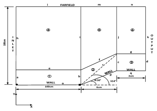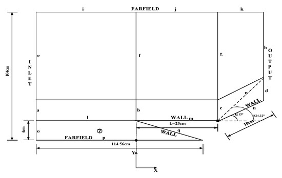 Next, we established and divided the external flow field model for the simulation, as shown in Figure 6. The bold black dot is the (0,0) point of the coordinate system. Lines o and q are the flat plate and line p is the wedge section. The bold black square point is the origin of the wedge section.