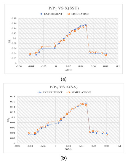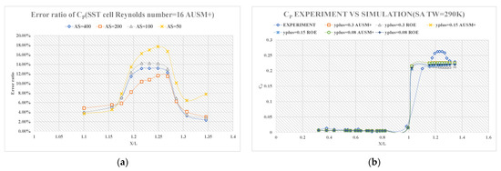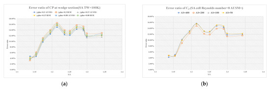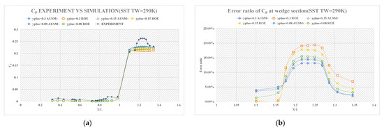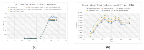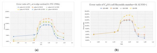 (a) error ratio of wall pressure coefficient distribution diagram at the wedge section adopting Spalart-Allmaras at TW = 290 K; (b) error ratio of wall pressure coefficient distribution diagram at the wedge section adopting four different aspect ratios.