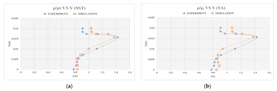 Figure 8 shows the wall surface pressure distributions from the experiment and the simulation, where the X-axis x is the distance to the original point of the wedge section and the Y-axis is the ratio between the wall surface pressure and the total pressure of the freestream. The overall tracking effect of the simulation data on the experiment data was acceptable. The simulation errors of the two models were very close at the upper stream of the wedge section. At the wedge section, where x was bigger than 0, the mean error rate of SST k-omega data was 4.76%, and that of Spalart-Allmaras was 5.19%. The variance of SST k-omega simulation error was 0.001043, and that of Spalart-Allmaras was 0.003091. Figure 9 indicates the density profiles at x = 0 from the experiment and the simulation, the X-axis is the ratio between local density and the freestream density, and the Y-axis is the y location. The average error rate of the SST k-omega data was 7.92%, and that of Spalart-Allmaras was 10.04%. The variance of the SST k-omega simulation error was 0.00307, and that of Spalart-Allmaras was 0.003417. In general, the trend of the simulation results was in good agreement with the experimental data, and the SST k-omega simulation results were better than those of Spalart-Allmaras at the supersonic stage.